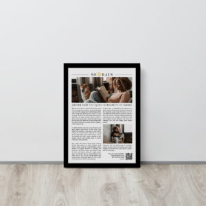 The article is printed in A3 format and always comes with a black wooden frame. It is produced in full color on high quality paper and protected with a clear cover to ensure durability over time. The frame supports the story without taking attention away from it, allowing the words to remain the true centerpiece.