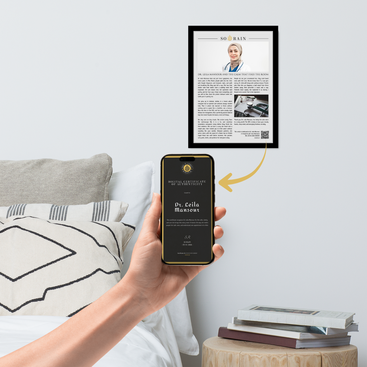 Every framed article includes a private digital certificate that authenticates the piece. The certificate contains the honored name, the theme of the article, a unique serial number, and the date of creation. Access is granted through a QR code printed directly on the article. The certificate is private by default and can only be shared publicly if the honored person chooses to do so. The link is permanent and remains accessible over time.