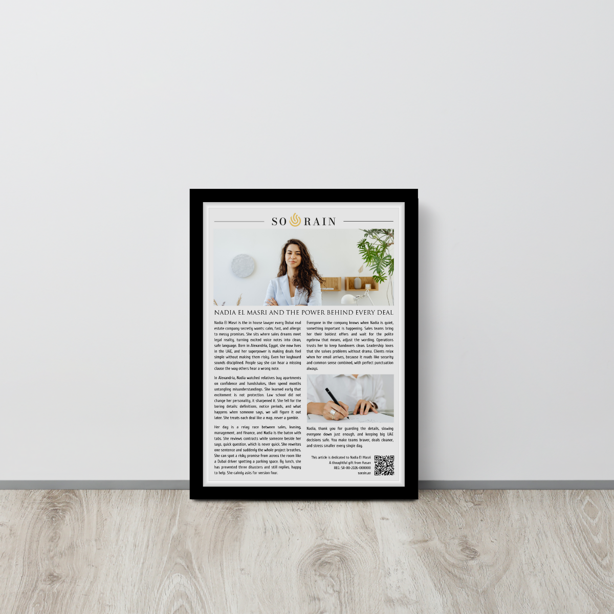 The framed piece features a short editorial style article written to feel like it was written about them, not about lawyers in general. You can personalize it with their city in the UAE, their specialty, the kind of cases they handle, and the phrases they always say when everyone else is being dramatic.