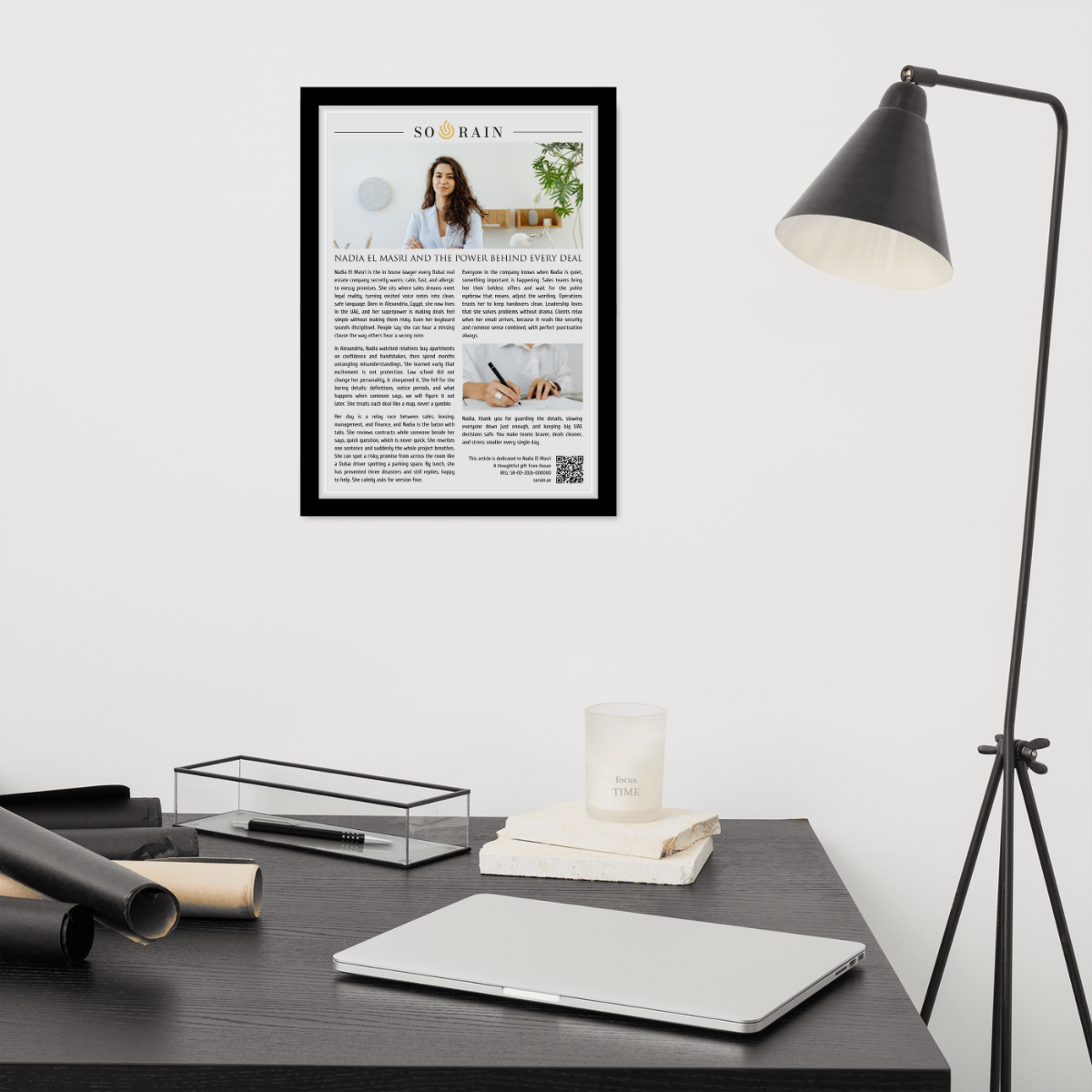 Each piece is professionally printed in A3 format and delivered fully framed. The frame is made of black wood and includes a protective transparent cover to preserve the article over time. The print is produced on matte photographic paper, chosen to enhance readability, texture, and visual depth. All articles are printed in full color to reflect the editorial character and emotional intention of each piece.