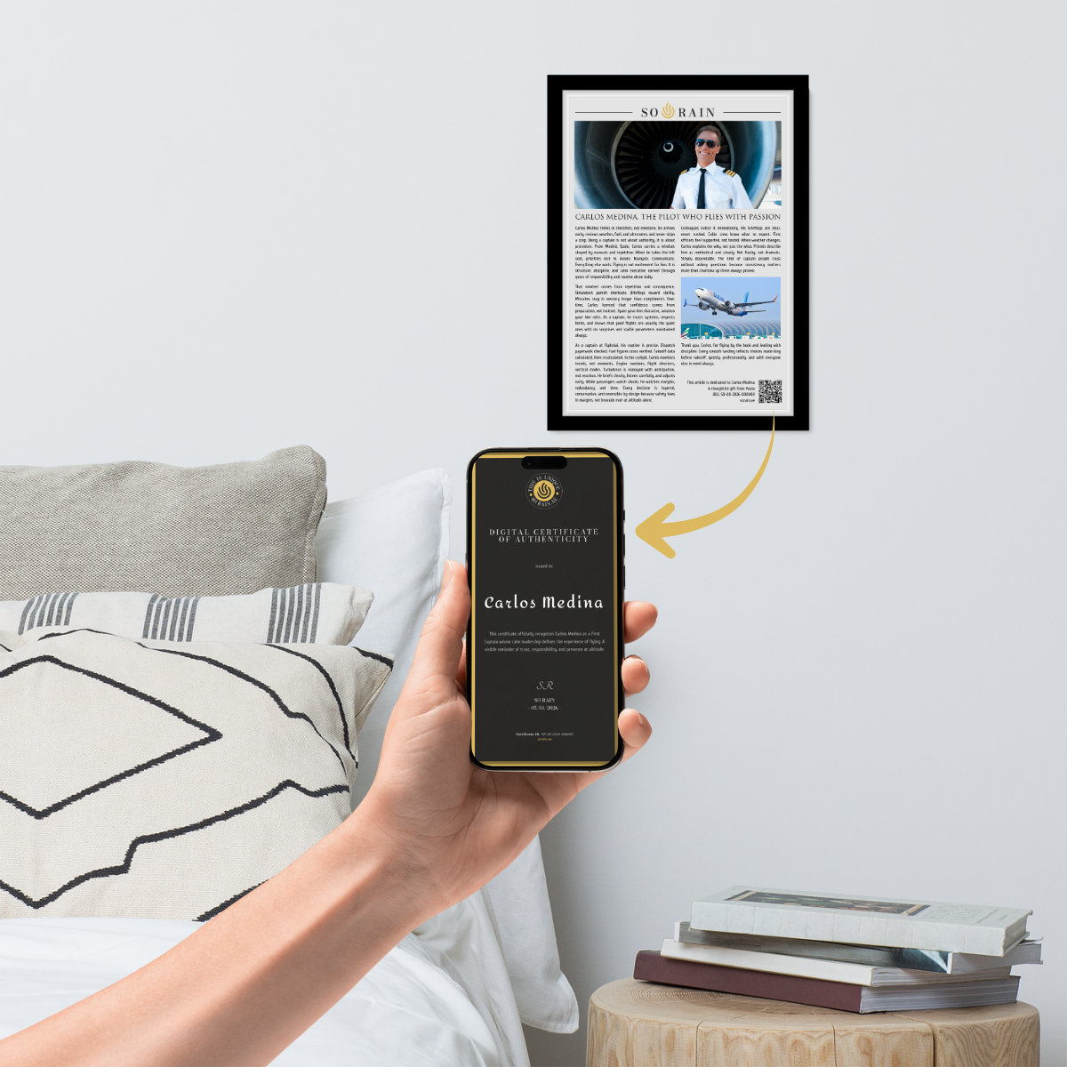 Every framed article includes a private digital certificate that authenticates the piece. The certificate contains the honored name, the theme of the article, a unique serial number, and the date of creation. Access is granted through a QR code printed directly on the article. The certificate is private by default and can only be shared publicly if the honored person chooses to do so. The link is permanent and remains accessible over time.