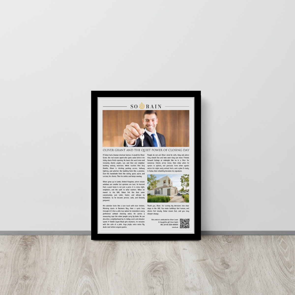 Your framed piece includes a custom written editorial style article that captures their habits, their daily rhythm, and the very specific confidence that comes with guiding decisions in Dubai and across the UAE. It reads like a spotlight, not a generic compliment. It is the kind of page they will hang in the office because it feels true.