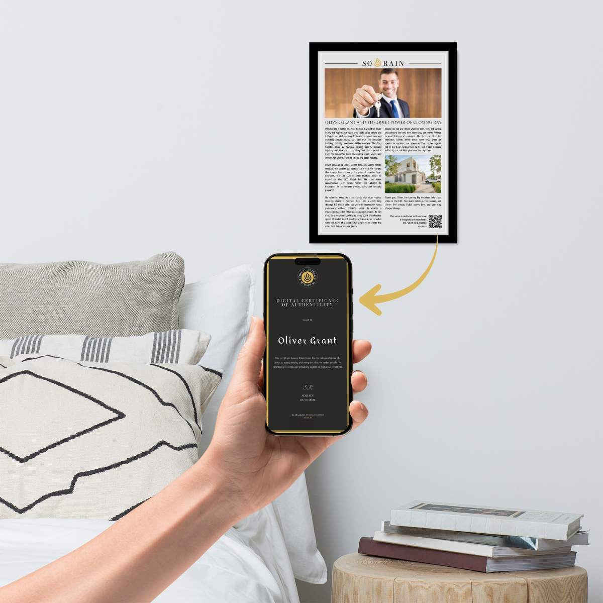 At the bottom of the framed article there is a QR code with a mention of the buyer, a unique serial number, and a link to the digital certificate. When the protagonist scans the QR code, they access their digital certificate, which honors their obsession with helping people find the right place, validates the serial number, and authenticates the piece.
