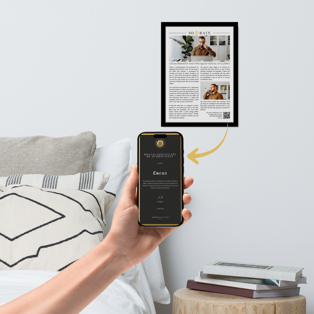 Every framed article includes a private digital certificate that authenticates the piece. The certificate contains the honored name, the theme of the article, a unique serial number, and the date of creation. Access is granted through a QR code printed directly on the article. The certificate is private by default and can only be shared publicly if the honored person chooses to do so. The link is permanent and remains accessible over time.