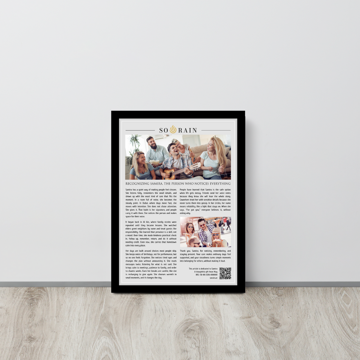 Once approved, we carefully print and frame the article as a lasting keepsake. The final piece is prepared with care and arrives ready to be displayed, appreciated, and remembered.