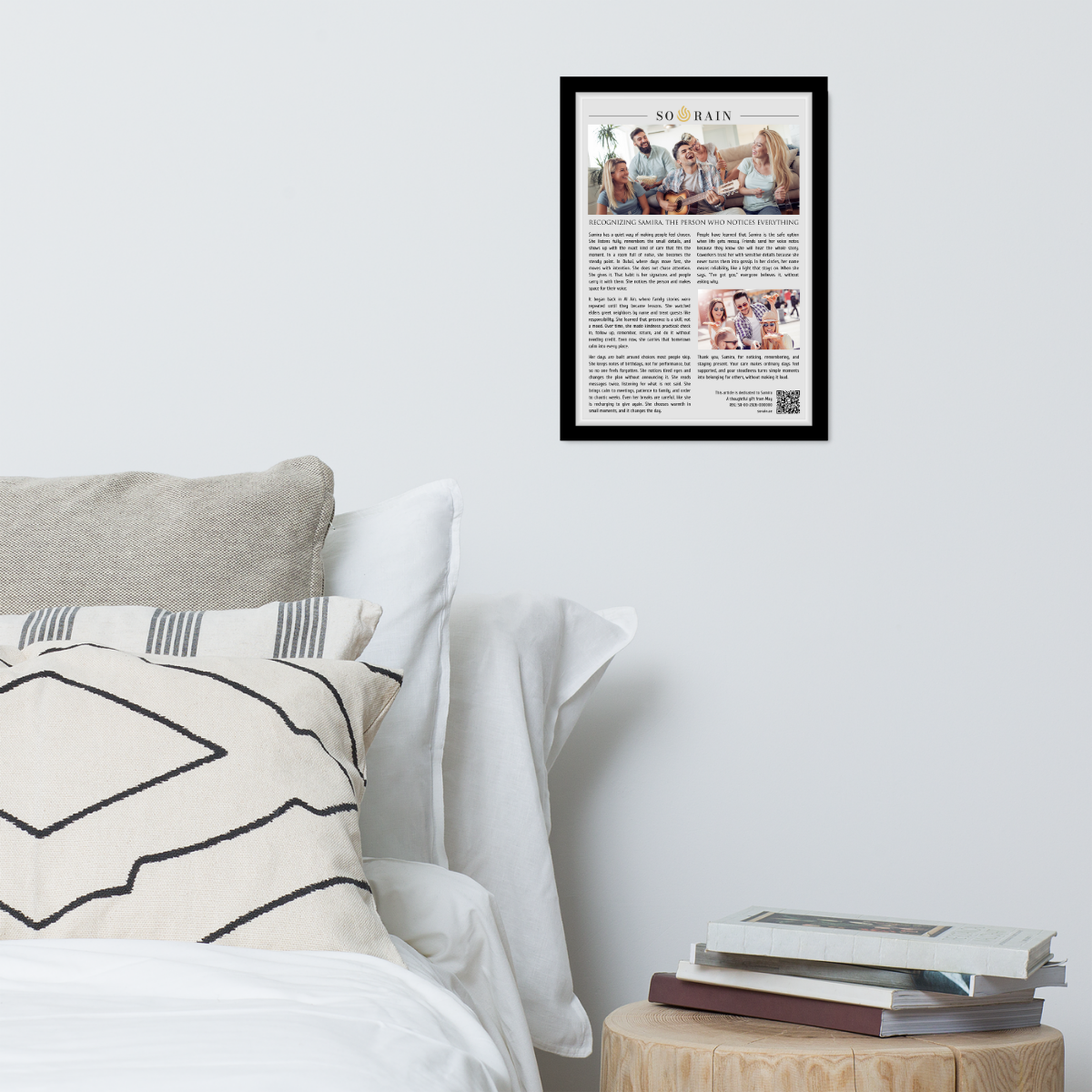 You define the theme in minutes, and we turn it into a physical framed editorial piece they’ll display, reread, and proudly say, “That’s so me.”