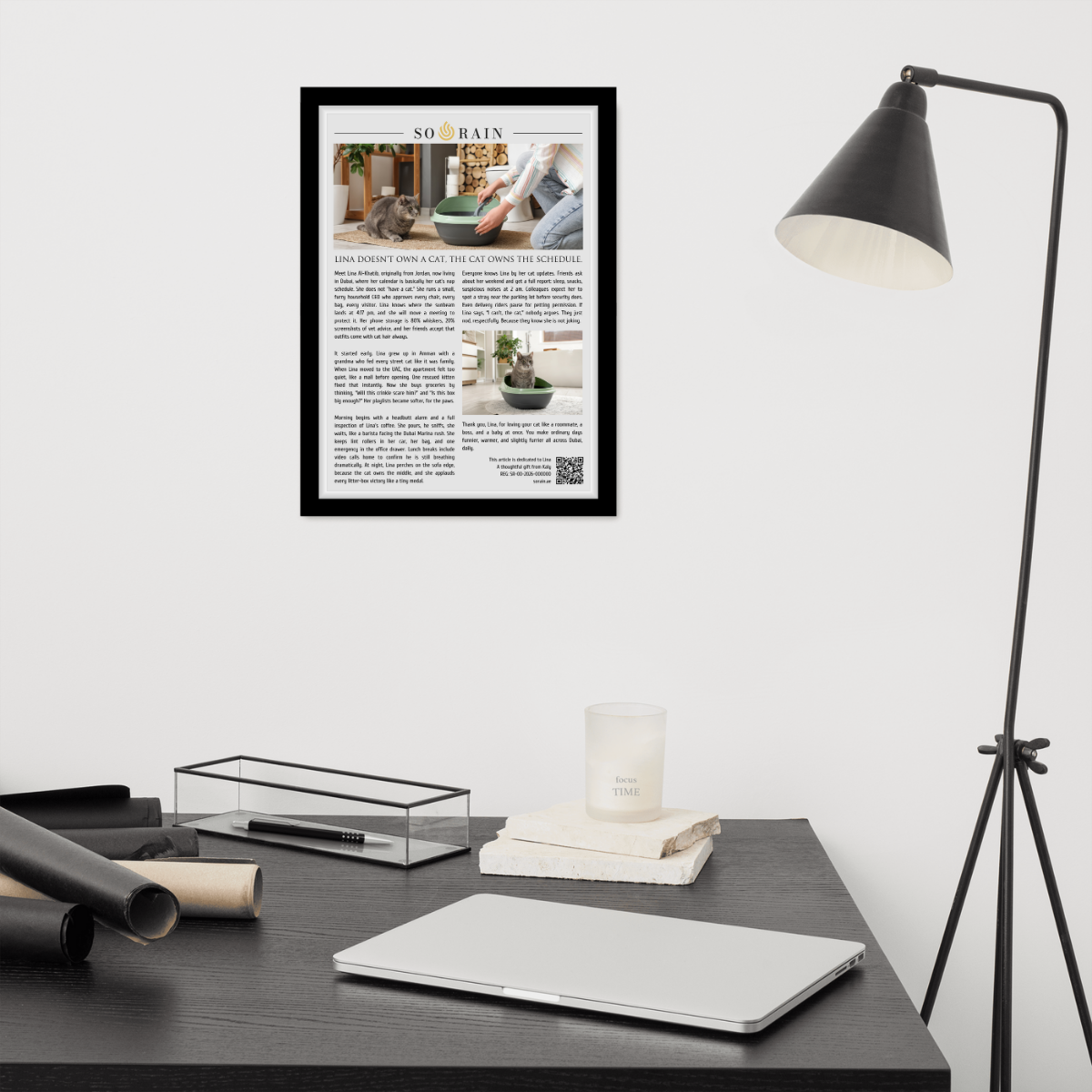 Each piece is professionally printed in A3 format and delivered fully framed. The frame is made of black wood and includes a protective transparent cover to preserve the article over time. The print is produced on matte photographic paper, chosen to enhance readability, texture, and visual depth. All articles are printed in full color to reflect the editorial character and emotional intention of each piece.