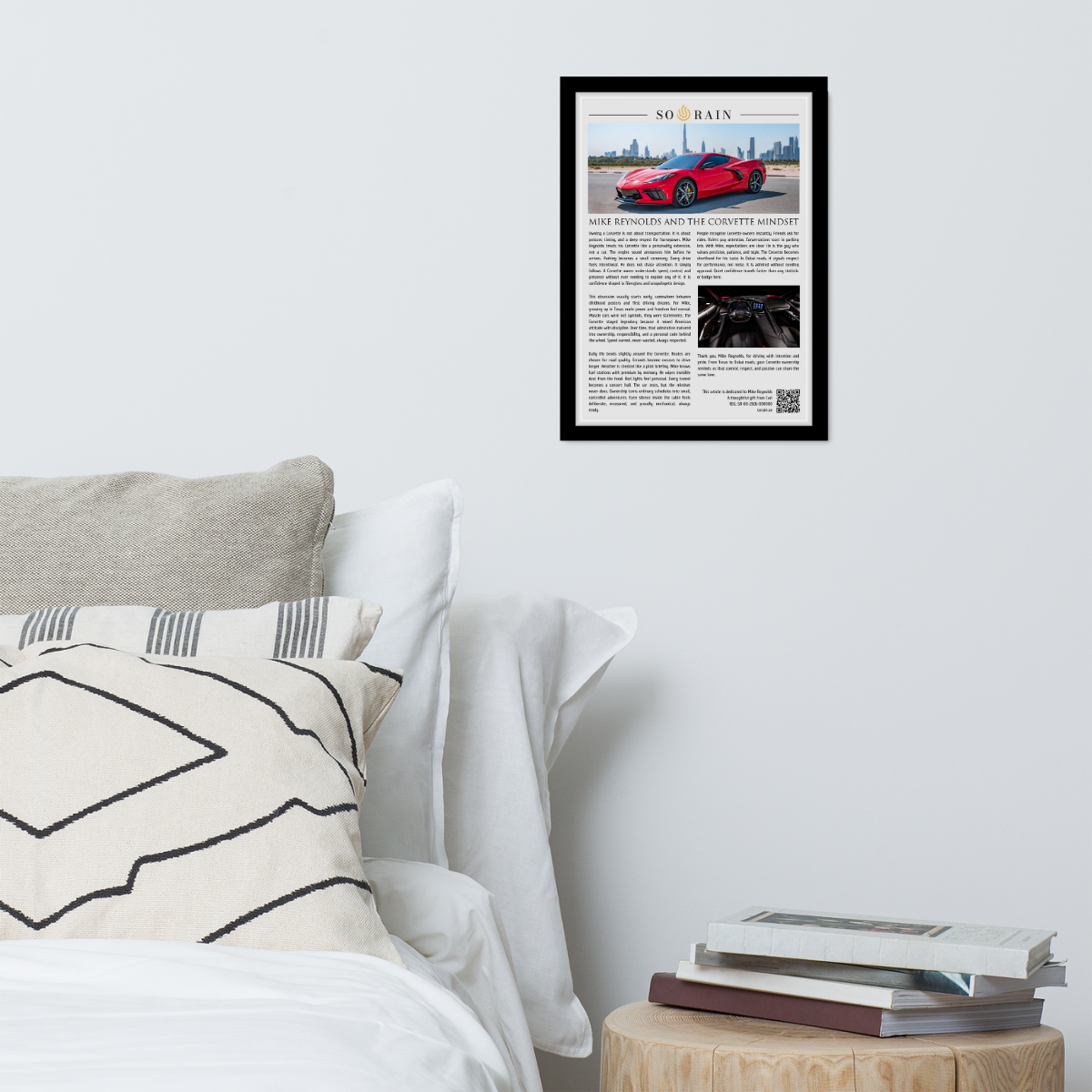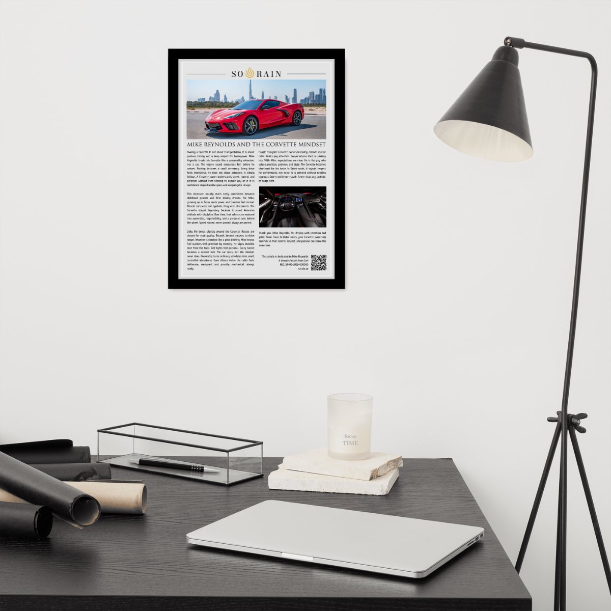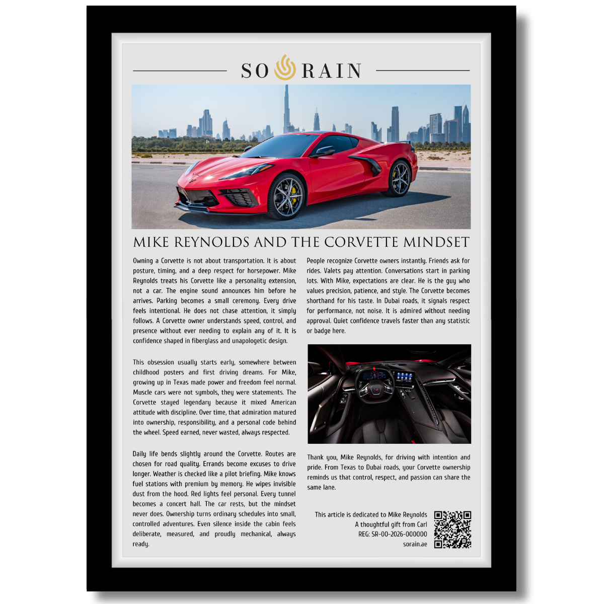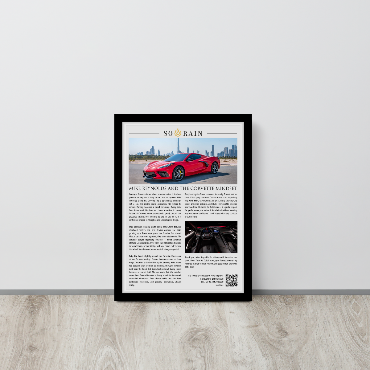 Each piece is custom written, reviewed, and approved before production, ensuring it reflects the personality and story behind the wheel. The framed article includes a QR code that leads to a digital certificate validating the recognition, serial number, and dedication, making every piece unique and collectible.