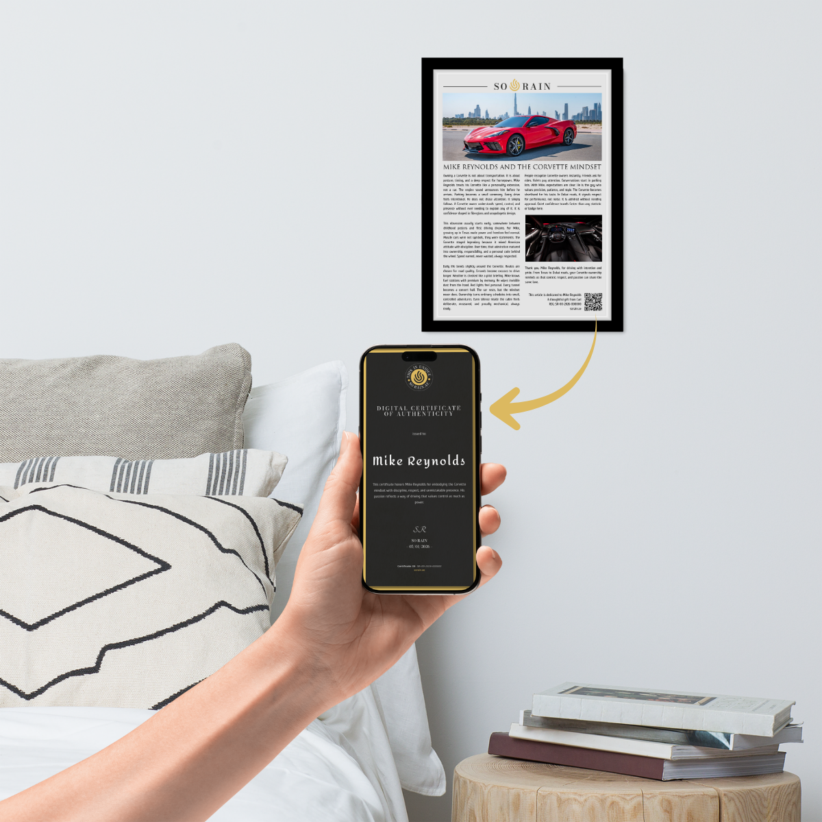 Every framed article includes a private digital certificate that authenticates the piece. The certificate contains the honored name, the theme of the article, a unique serial number, and the date of creation. Access is granted through a QR code printed directly on the article. The certificate is private by default and can only be shared publicly if the honored person chooses to do so. The link is permanent and remains accessible over time.
