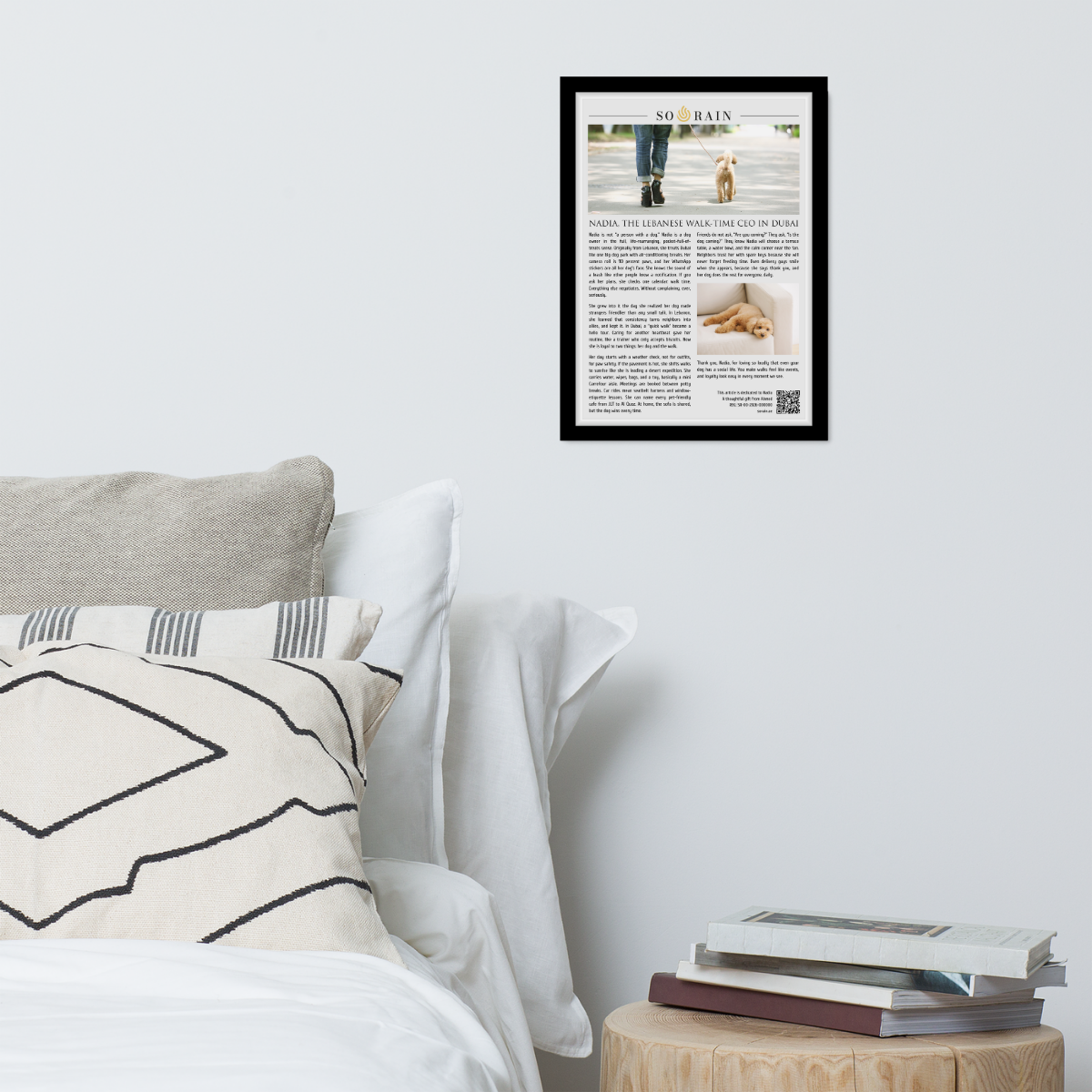 Each piece is professionally printed in A3 format and delivered fully framed. The frame is made of black wood and includes a protective transparent cover to preserve the article over time. The print is produced on matte photographic paper, chosen to enhance readability, texture, and visual depth. All articles are printed in full color to reflect the editorial character and emotional intention of each piece.