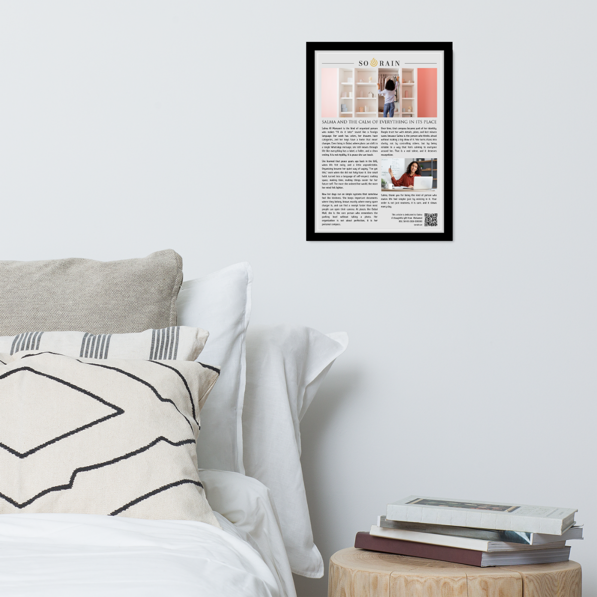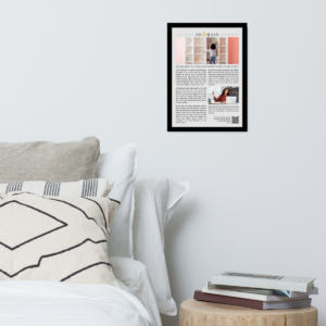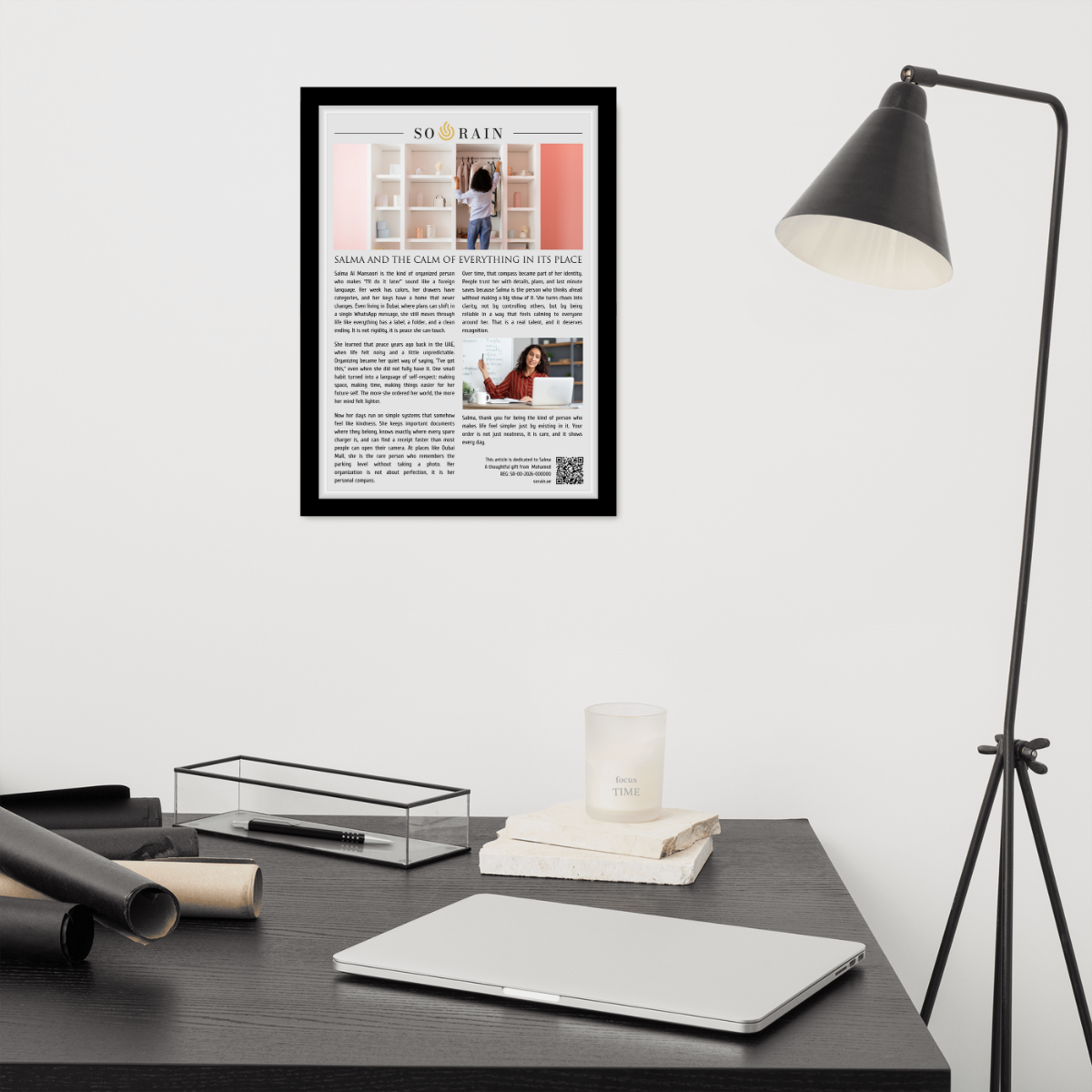 Each piece is professionally printed in A3 format and delivered fully framed. The frame is made of black wood and includes a protective transparent cover to preserve the article over time. The print is produced on matte photographic paper, chosen to enhance readability, texture, and visual depth. All articles are printed in full color to reflect the editorial character and emotional intention of each piece.
