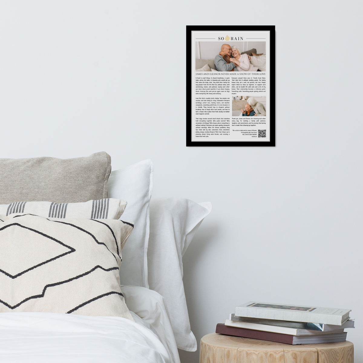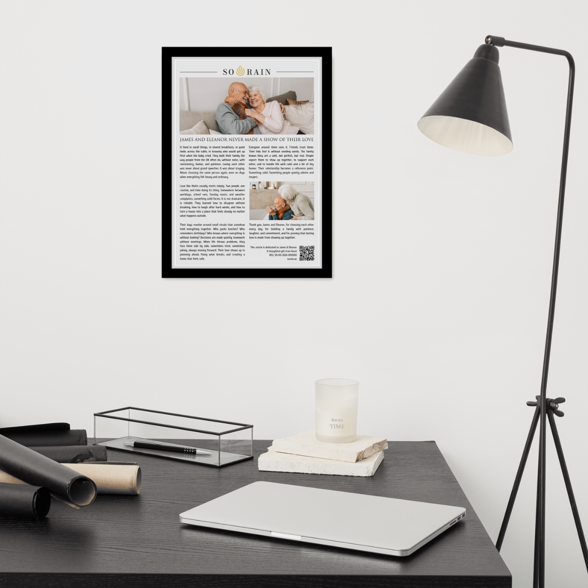 Each piece is printed in A3 size and framed, featuring a unique editorial article written specifically for them. At the bottom, a QR code leads to a digital certificate that includes their names, a unique serial number, and official validation of the piece.