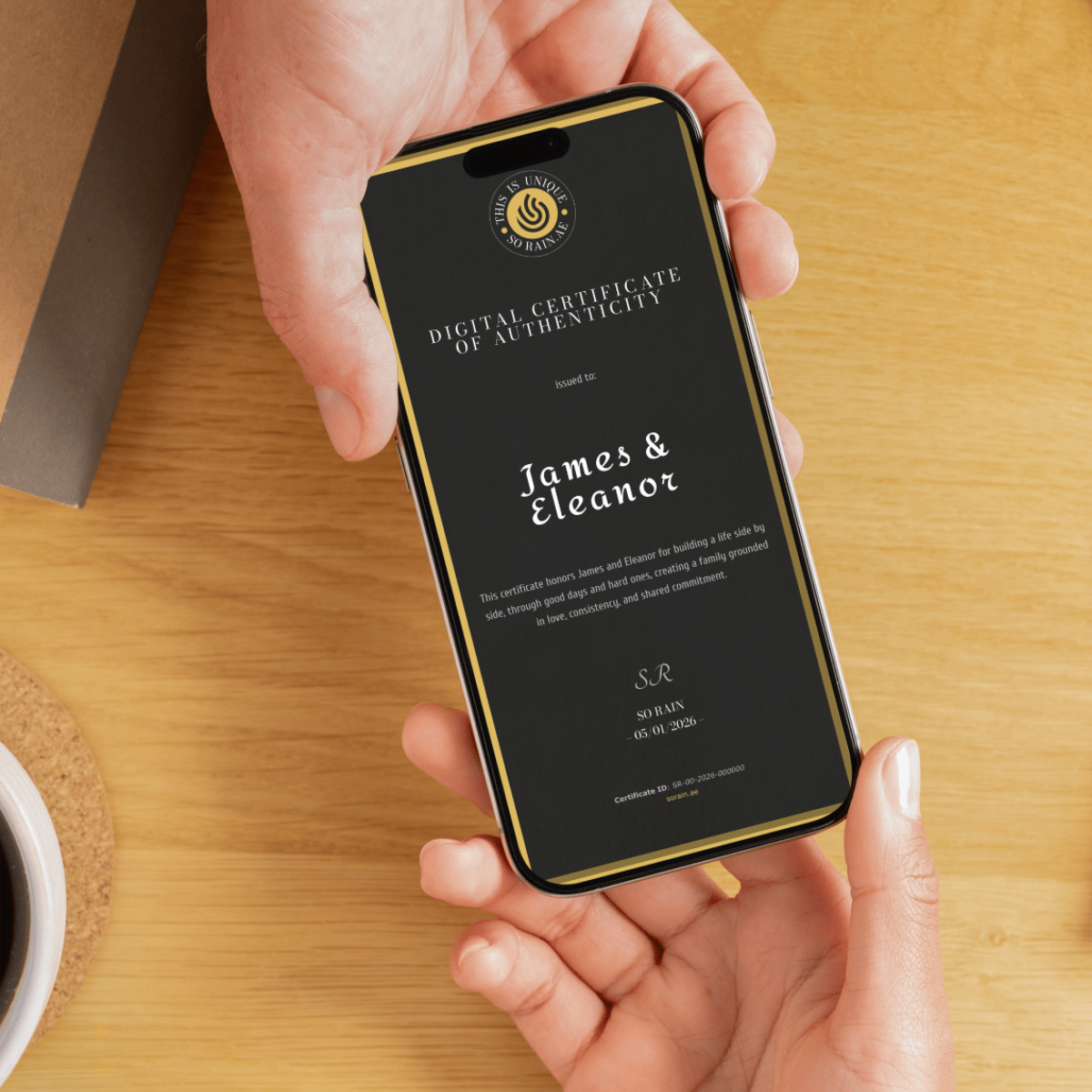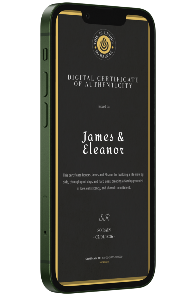 Every framed article includes a private digital certificate that authenticates the piece. The certificate contains the honored name, the theme of the article, a unique serial number, and the date of creation. Access is granted through a QR code printed directly on the article. The certificate is private by default and can only be shared publicly if the honored person chooses to do so. The link is permanent and remains accessible over time.