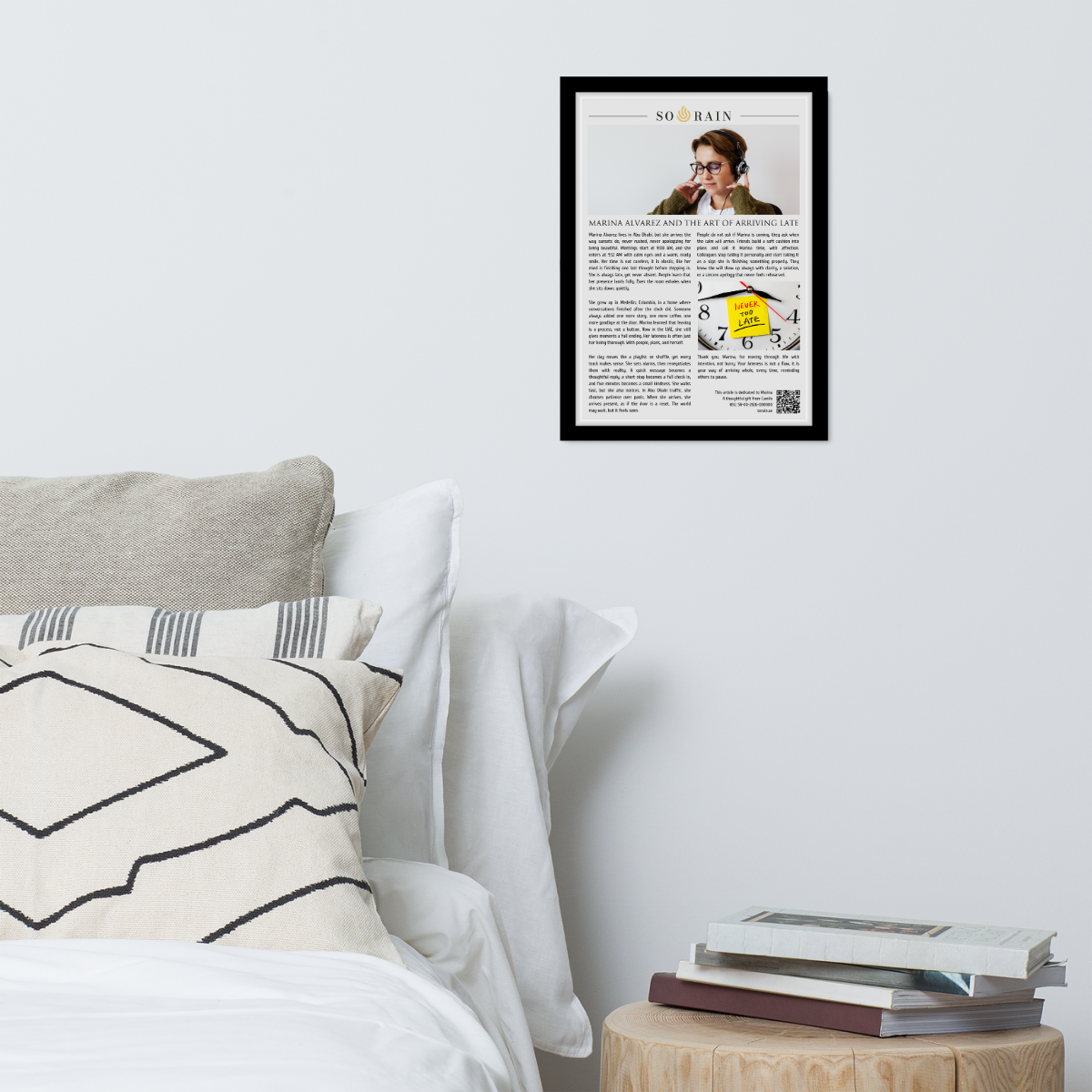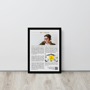 Each piece is professionally printed in A3 format and delivered fully framed. The frame is made of black wood and includes a protective transparent cover to preserve the article over time. The print is produced on matte photographic paper, chosen to enhance readability, texture, and visual depth. All articles are printed in full color to reflect the editorial character and emotional intention of each piece.