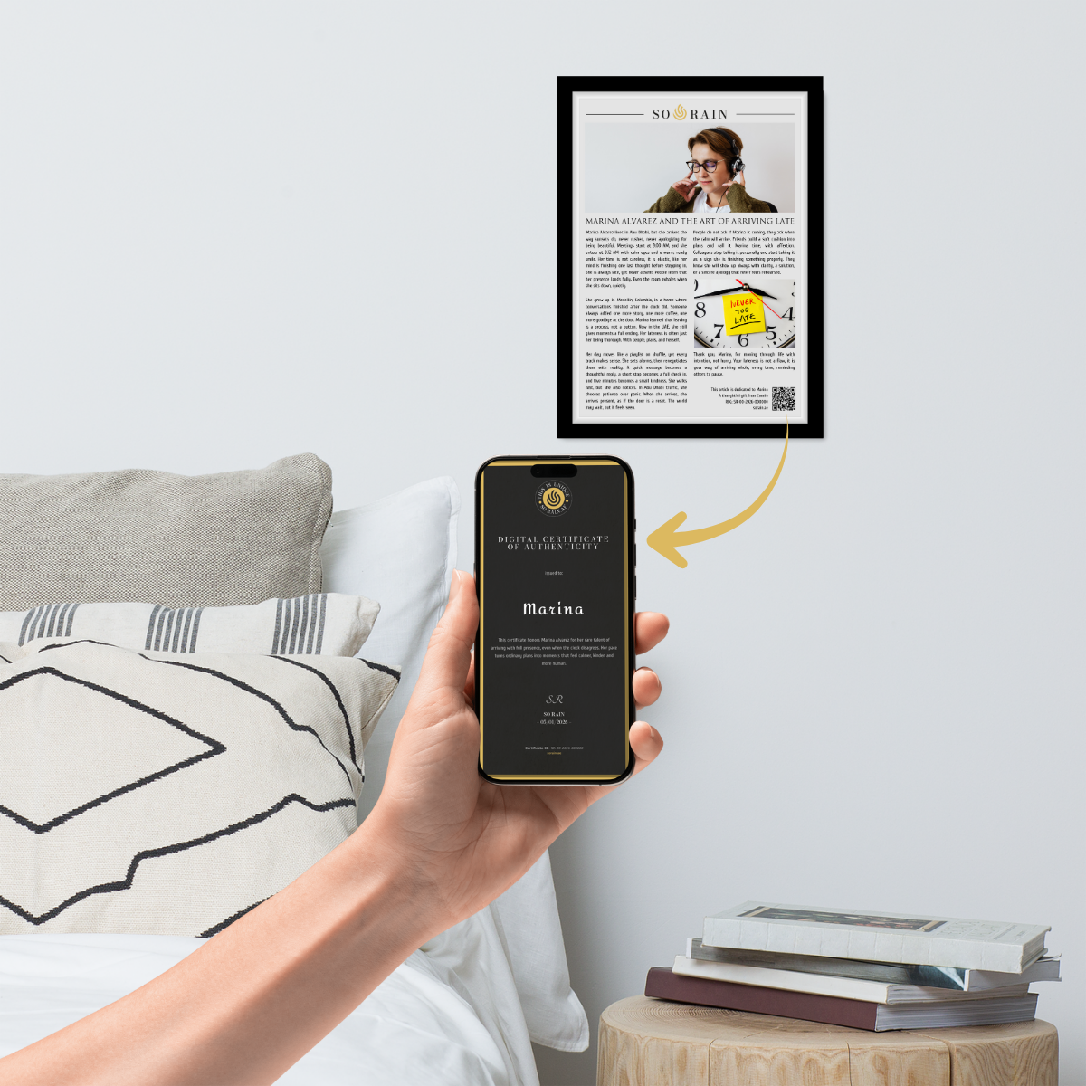 Every framed article includes a private digital certificate that authenticates the piece. The certificate contains the honored name, the theme of the article, a unique serial number, and the date of creation. Access is granted through a QR code printed directly on the article. The certificate is private by default and can only be shared publicly if the honored person chooses to do so. The link is permanent and remains accessible over time.