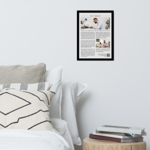 Each piece is professionally printed in A3 format and delivered fully framed. The frame is made of black wood and includes a protective transparent cover to preserve the article over time. The print is produced on matte photographic paper, chosen to enhance readability, texture, and visual depth. All articles are printed in full color to reflect the editorial character and emotional intention of each piece.