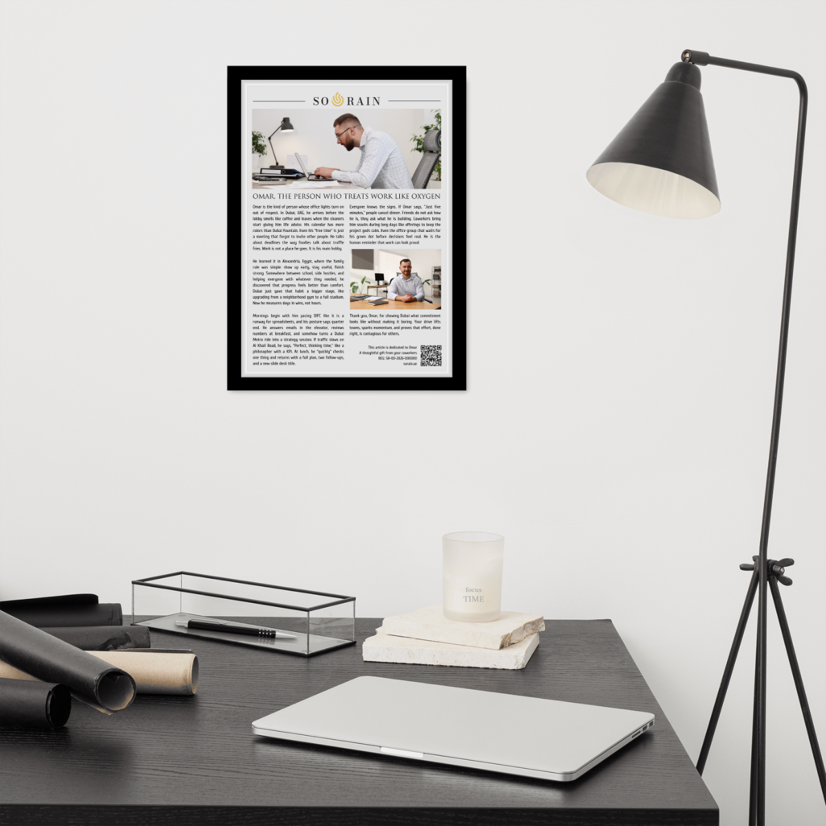Here is how it works. You tell us a few details about their work habits, their role, and the little things everyone notices. We write a personalized editorial style article that sounds like it was written for them, not for the internet. Before anything is produced, you get to review the draft and request changes, so the final piece feels accurate and personal. Once approved, the article is professionally printed, framed, and delivered in the UAE, ready to hang in an office or at home.